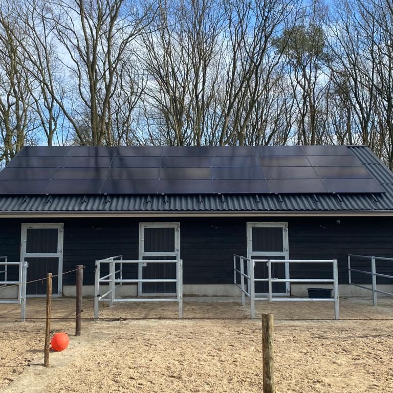 Op deze paardenstal zijn 28 panelen geplaatst. Door het gebruiken van een zwart onderstel valt de onderconstructie minder op. Deze klant heeft gekozen voor Enphase. Doormiddel van micro omvormers kan deze klant de opbrengst van elk paneel inzichtelijk krijgen.