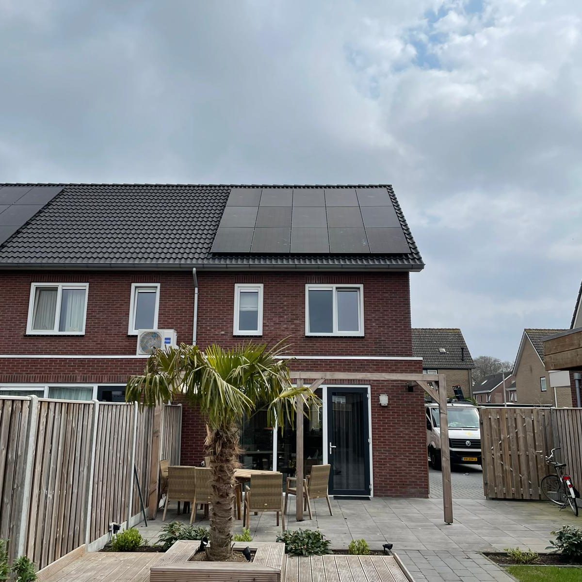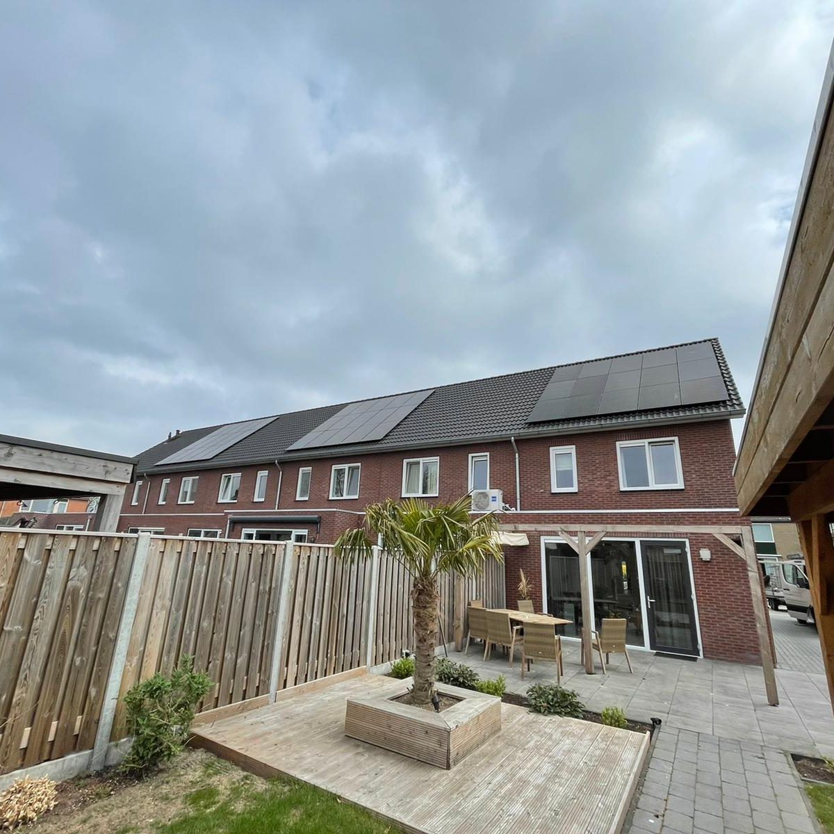 Op deze woning liggen op allebeide dakvlakken zonnepanelen. Hier is gekozen voor een SolarEdge omvormer met optimizers. Deze optimizers worden onder elke paneel geïnstalleerd. En zorgen ervoor dat elk paneel zijn eigen opbrengst heeft. Zo heb je er geen last van dat als er één paneel schaduw vorming heeft de rest van de panelen het ook minder doen.